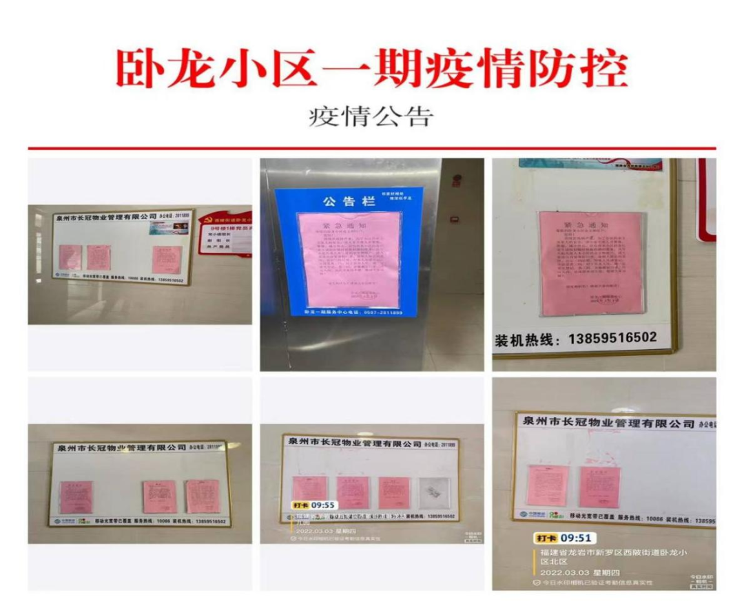 因陽(yáng)性患者居住在龍輝小區,龍輝小區被定為封控區域。而臥龍小區就僅隔一條馬路,應對當前嚴重復雜疫情時(shí)期,“疫情就是責任,防控就是義務(wù)”福建省長(cháng)冠物業(yè)管理有限公司龍巖分公司總經(jīng)理連新芳的召開(kāi)緊急會(huì )議,緊急部署小區疫情防控工作,為確保小區全體業(yè)主的人身安全,親自帶領(lǐng)全體物業(yè)人員在疫情第一線(xiàn),開(kāi)展疫情防控工作,維護了小區業(yè)主的健康平安: